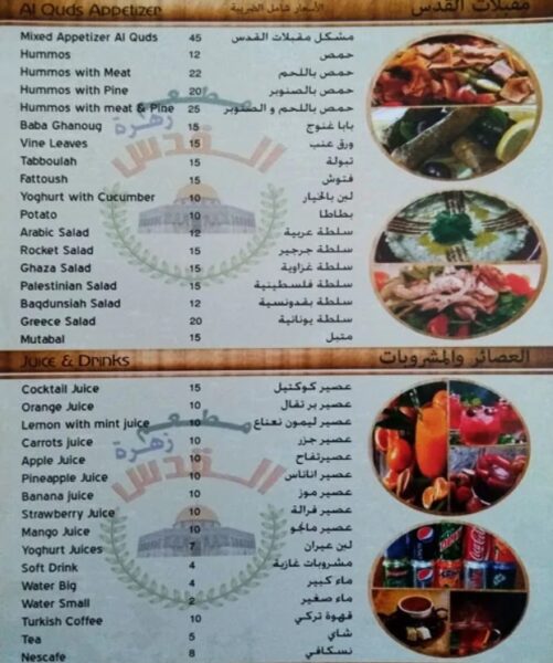 كما يحتوي منيو مطعم القدس على المسخن الفلسطيني، المحضر بزيت الزيتون الأصلي وخبز الطابون الطازج، وهو أحد أطباقنا المميزة من المطبخ الفلسطيني، كما يحتوي على نكهة الفلافل الفلسطيني وفتة الحمص المقدسية والفول، والحمص الفلسطيني بنكهات جديدة، والفول على الطريقة الفلسطينية.