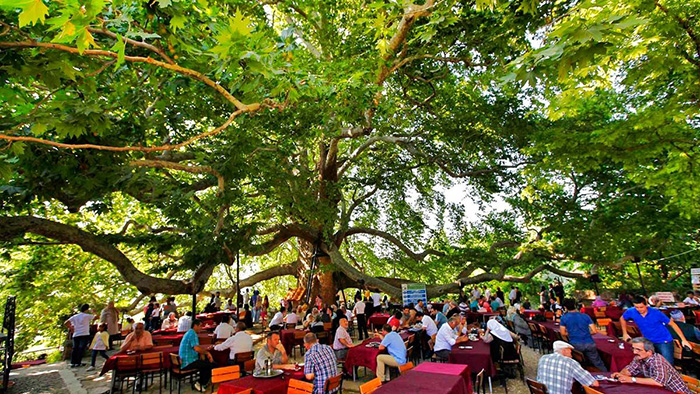 يحيط الشجرة التاريخية في بورصة مقهى ومطعم يتميز بأجوائه الرائعة وإطلالته البانورامية على مدينة بورصة، يقدم للزوار يوميا الفطور المحلي التقليدي الغني بأشهى أنواع الخضار والأجبان والألبان والمربيات وغيرها من الأصناف البلدية الطازجة. رحلة بورصة يوم واحد من اسطنبول
