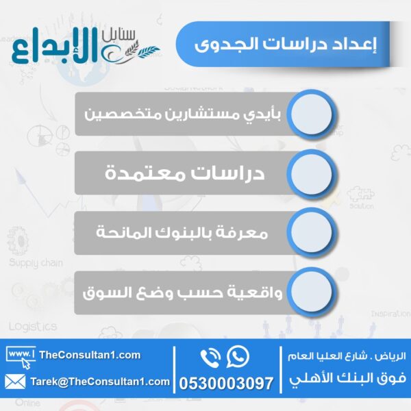 - مؤسسة سنابل الإبداع ومن مميزاتها الكثيرة أنها تملك خبرة واسعة تفوق العشر سنوات في مجال الأعمال وتصميم دراسات الجدوى، كما تقوم بالرد على جميع الاستشارات الاقتصادية، وتتميز بدراسة الأسواق والمحلات المنافسة لك للتعرف على مميزات المشروع والمشكلات وكيفية حلها.